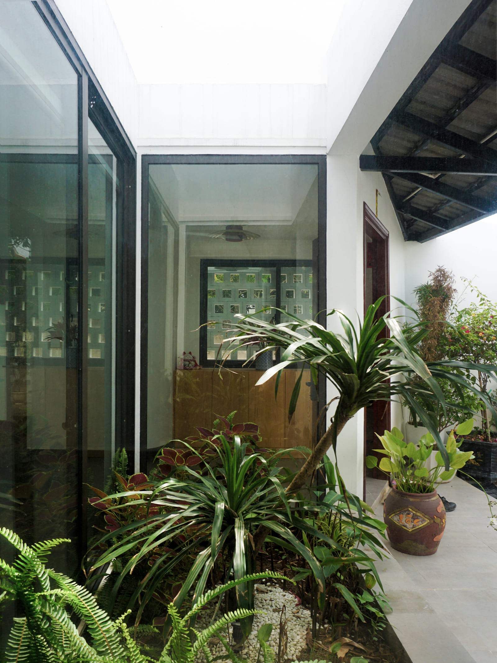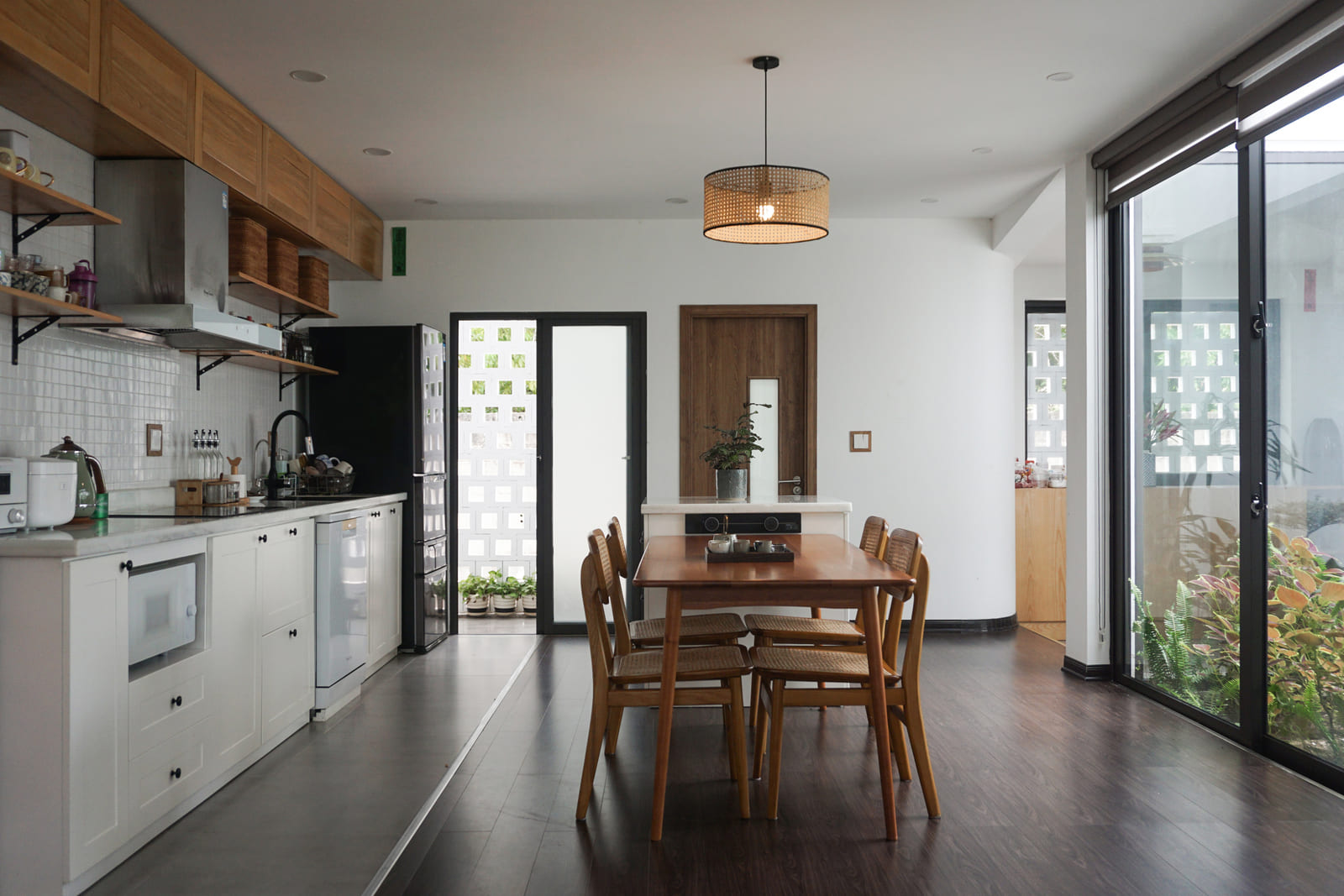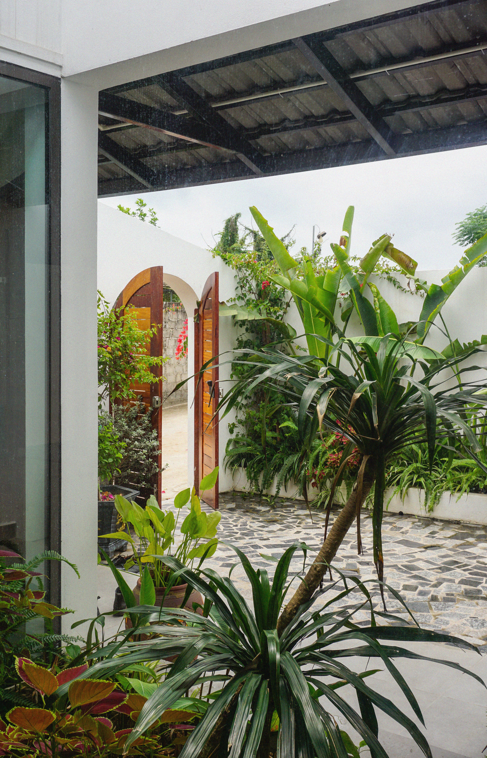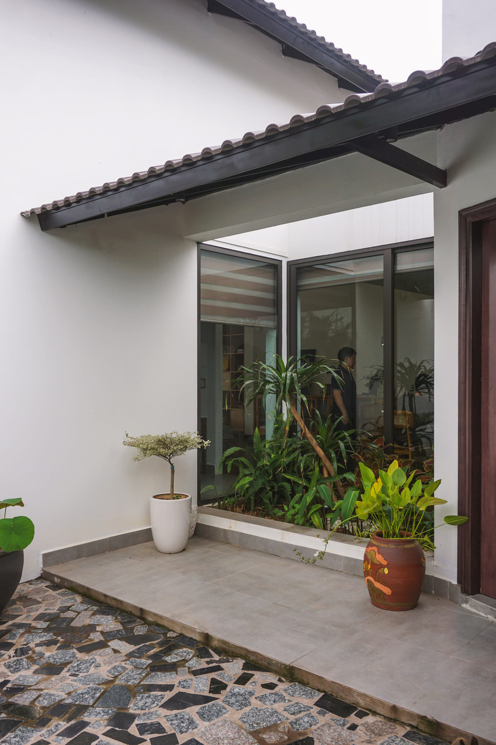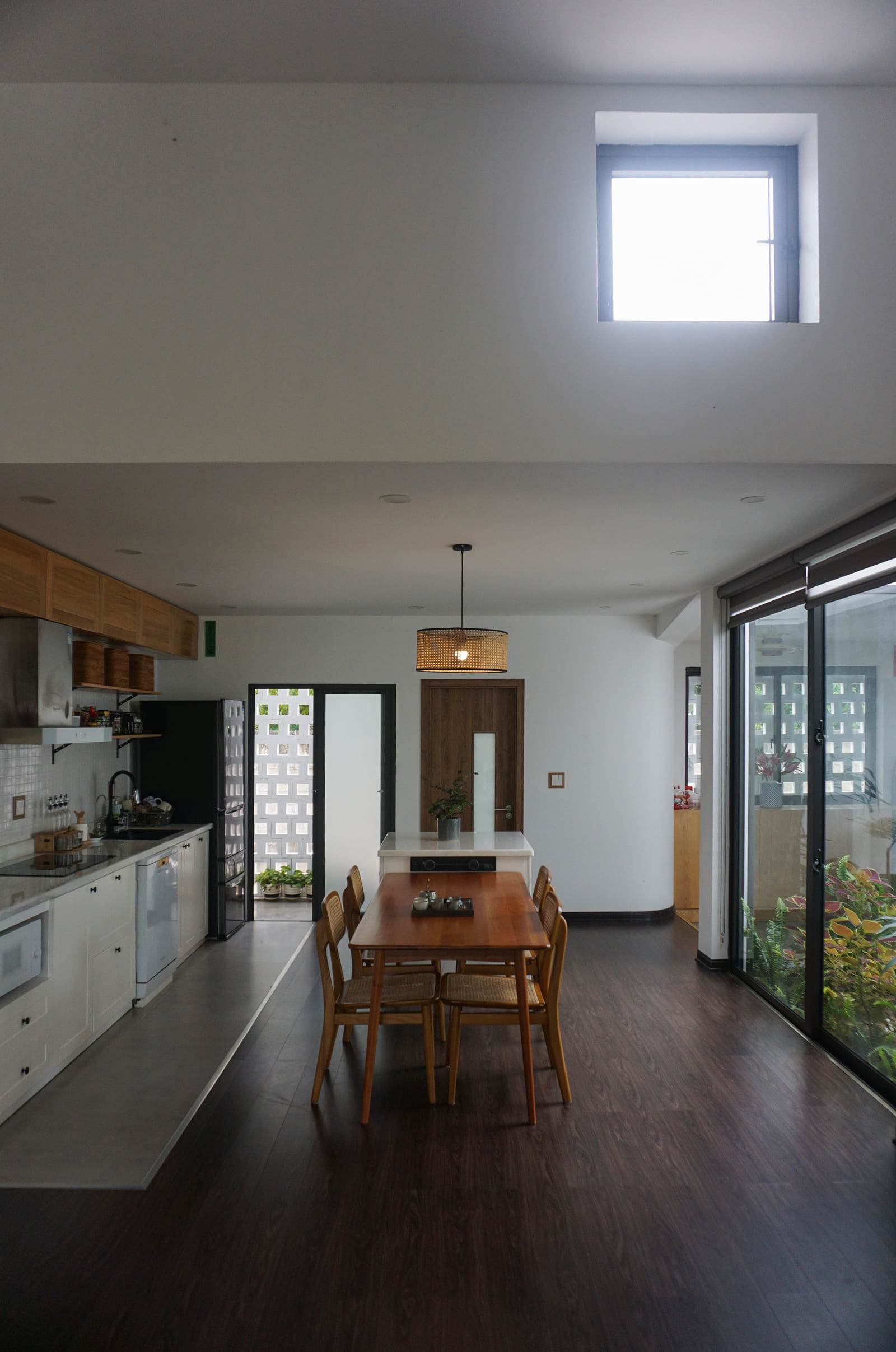 KCH là một công trình bán lưu trú “homestay” cải tạo lại từ một phần của nhà văn hóa cũ, với hệ kết cấu chung có sẵn, với những gì đã có, chúng tôi chọn hướng tiếp cận hạn chế tác động đến hệ kết cấu có sẵn, cấy thêm 1 lớp khung thép đỡ mái ngói, chừa lại khoảng sân trước và sau để đảm bảo đối lưu và vi khí hậu, tăng tính rieng tư cho không gian trong nhà.