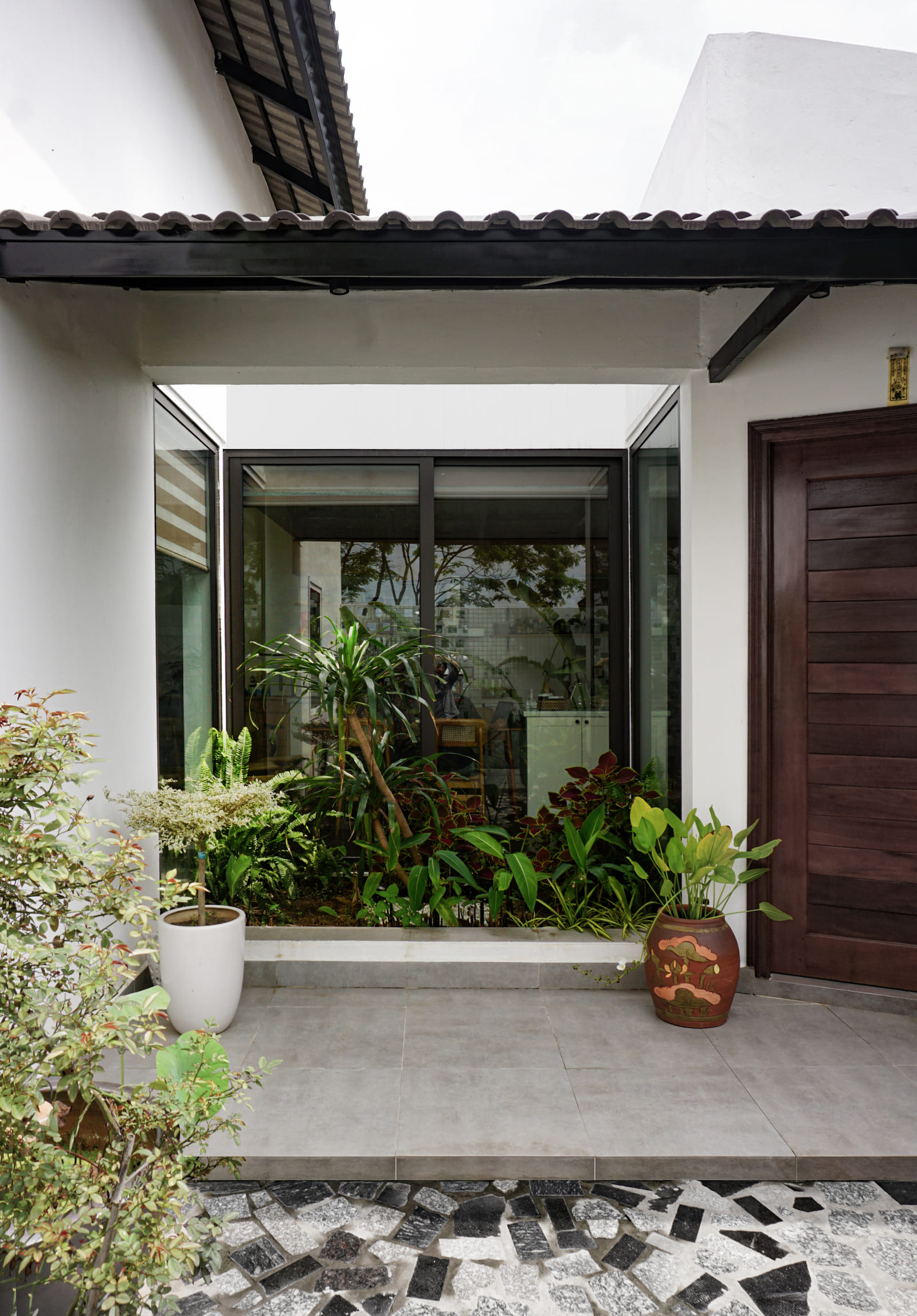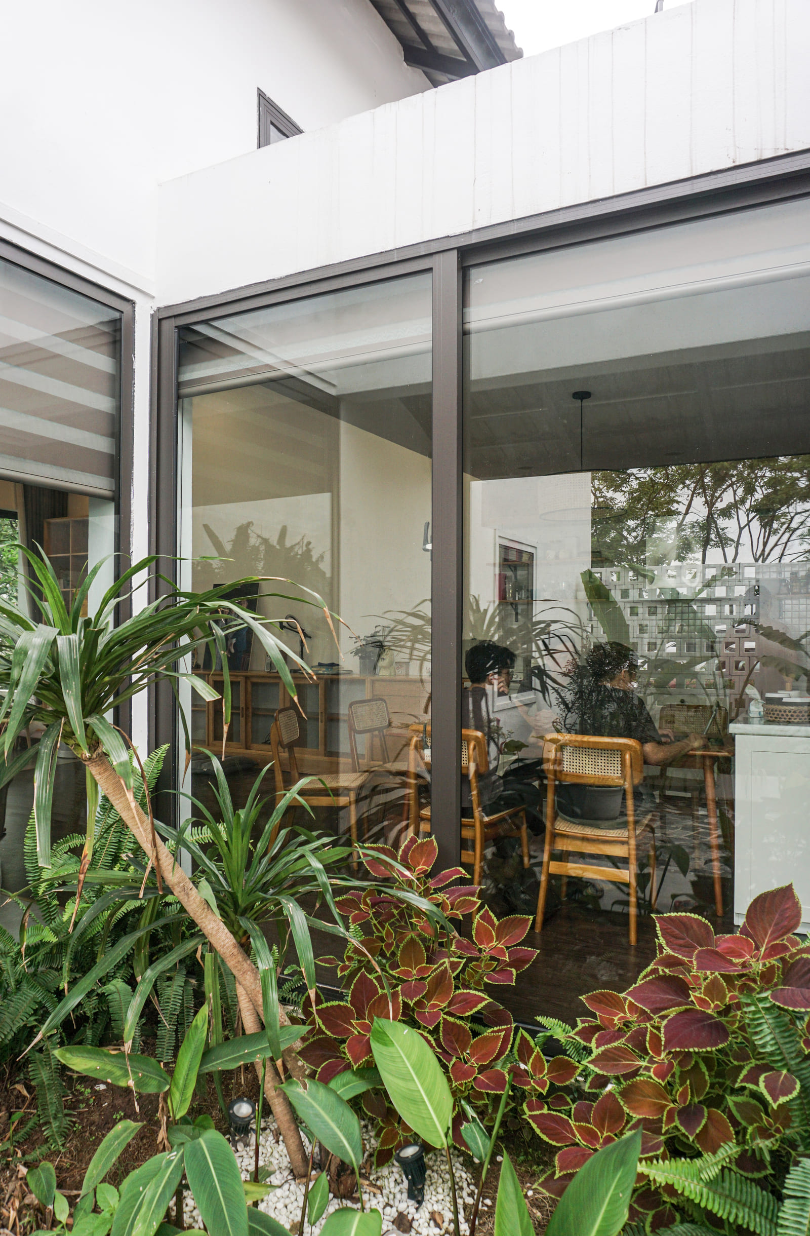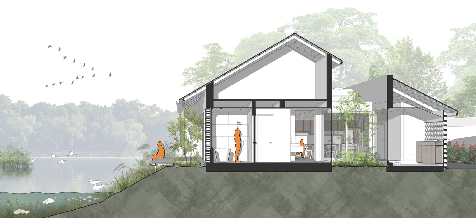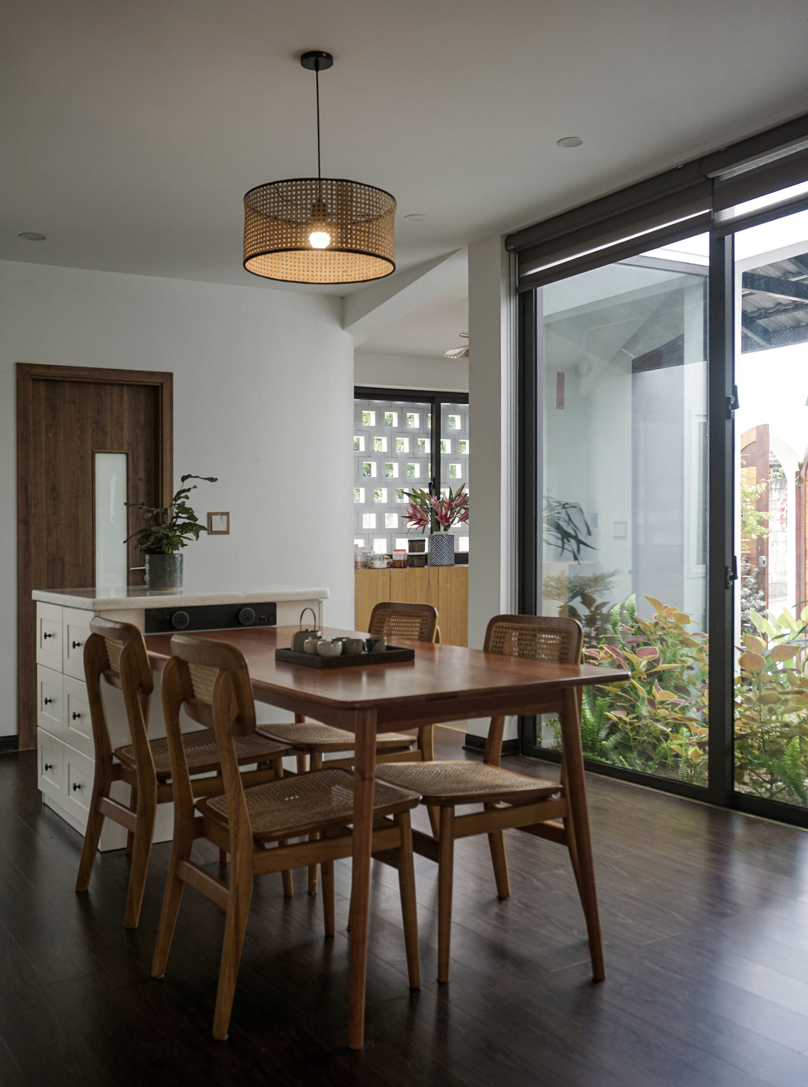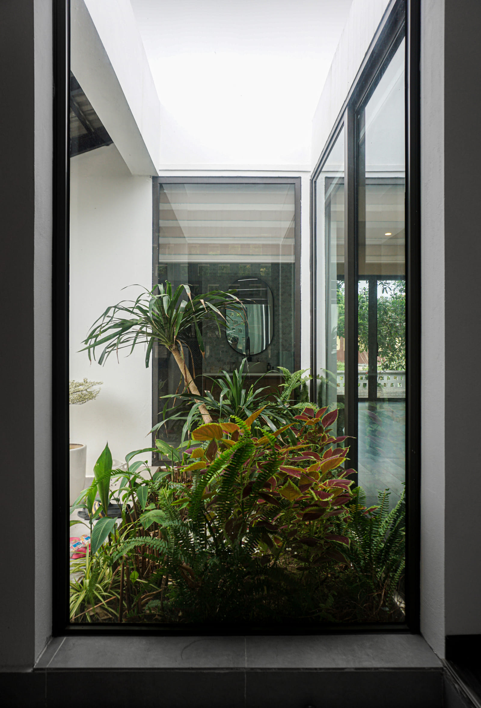 KCH là một công trình bán lưu trú “homestay” cải tạo lại từ một phần của nhà văn hóa cũ, với hệ kết cấu chung có sẵn, với những gì đã có, chúng tôi chọn hướng tiếp cận hạn chế tác động đến hệ kết cấu có sẵn, cấy thêm 1 lớp khung thép đỡ mái ngói, chừa lại khoảng sân trước và sau để đảm bảo đối lưu và vi khí hậu, tăng tính rieng tư cho không gian trong nhà.