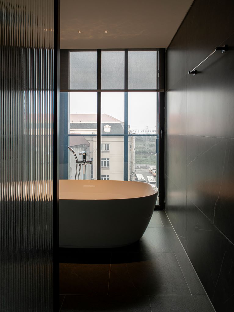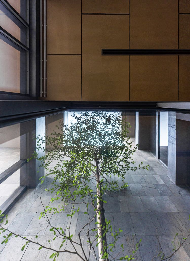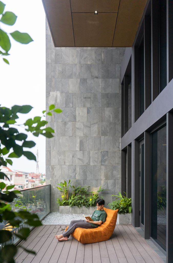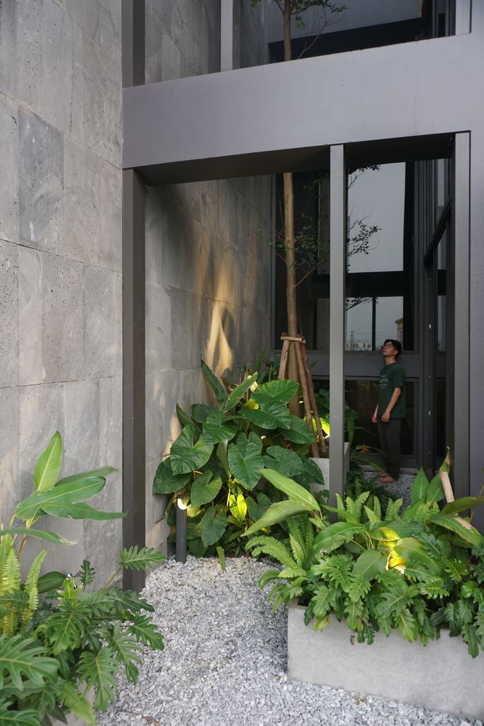 Một ý tưởng “vườn treo” trên khối ở được hình thành ngay từ khâu tư vấn thiết kế. Chức năng của khu vực này giúp ngăn ô nhiễm tiếng ồn, khói bụi từ bối cảnh vị trí khu đất, đồng thời tạo thành 1 lớp không gian mềm làm mờ đi sự thô kệch của đô thị. Khu vực vườn cây được đẩy sâu vào trong khối sinh hoạt để cảm nhận về sự thay đổi về thiên nhiên được gần gũi nhất.