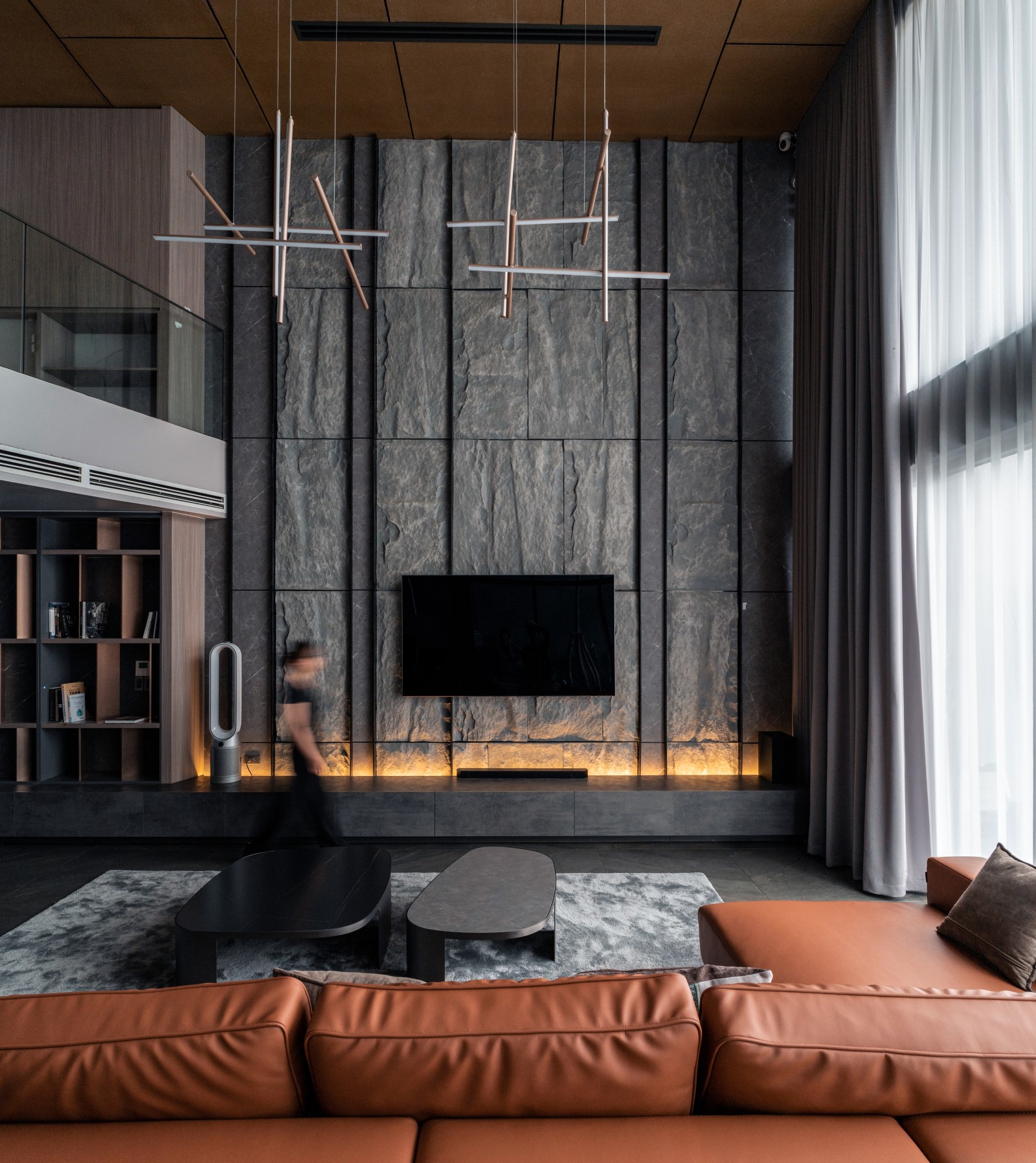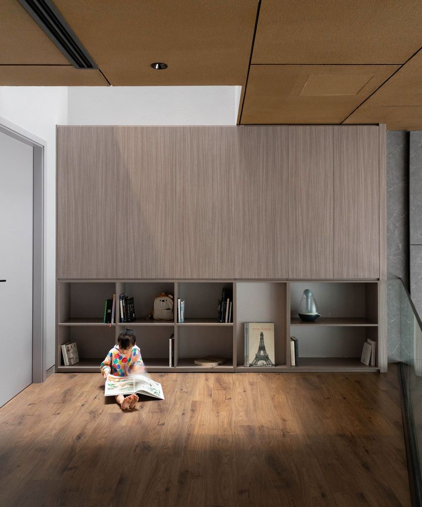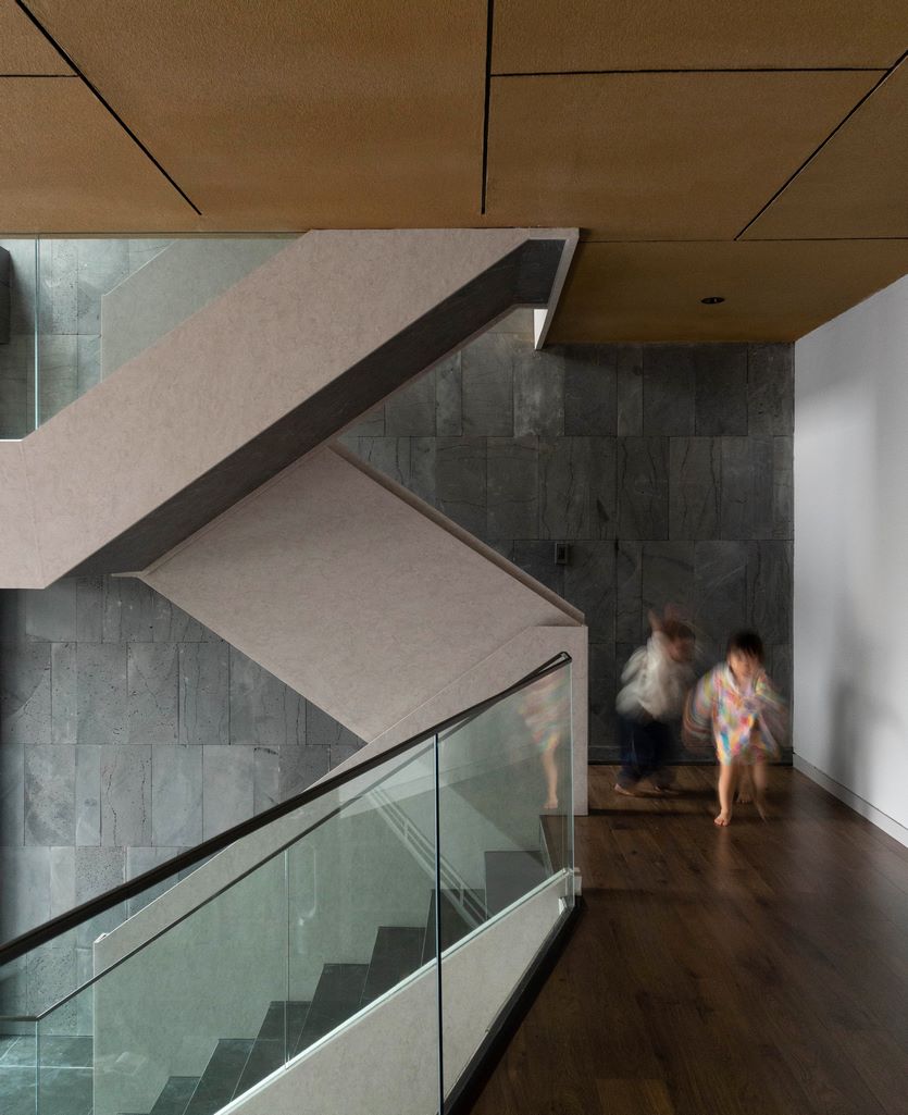 Khu vực sảnh thông tầng trong phòng khách cũng được khéo léo xoay chéo, để có thêm một góc nho nhỏ cho hai bé con vui chơi học tập, giúp cho sự tương tác của gia đình được cởi mở hơn. Tại vị trí này cũng được bố trí ô thông tầng để lấy ánh sáng gián tiếp và tạo lối cho thông gió tự nhiên.