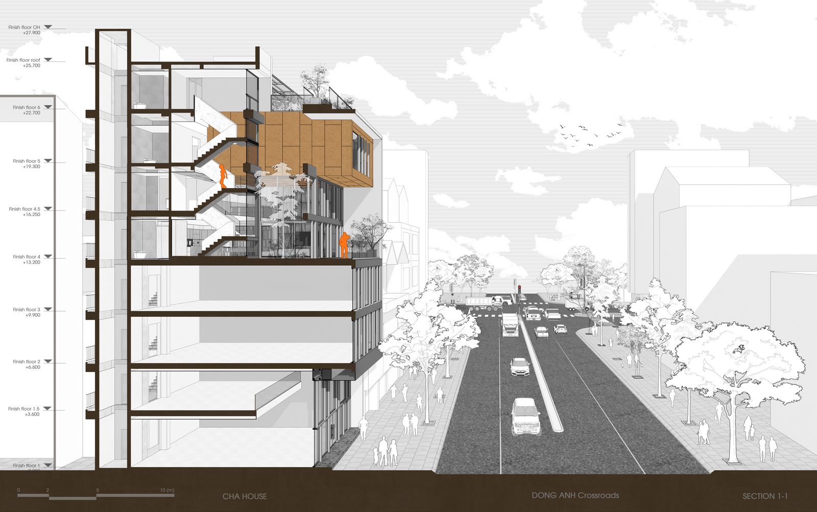 Công trình CHA HOUSE nằm trên khu đất 8.5x15 ở vị trí trung tâm ngã tư Đông Anh, nơi có mật độ xây dựng và mật độ giao thông cao. Căn nhà được thiết kế với mục đích kinh doanh kết hợp với gia đình 3 thế hệ.
