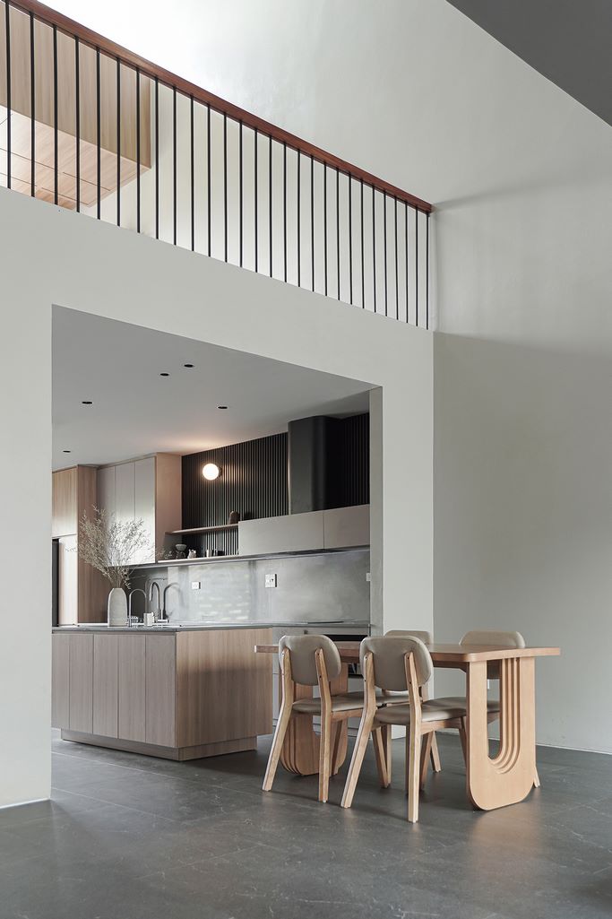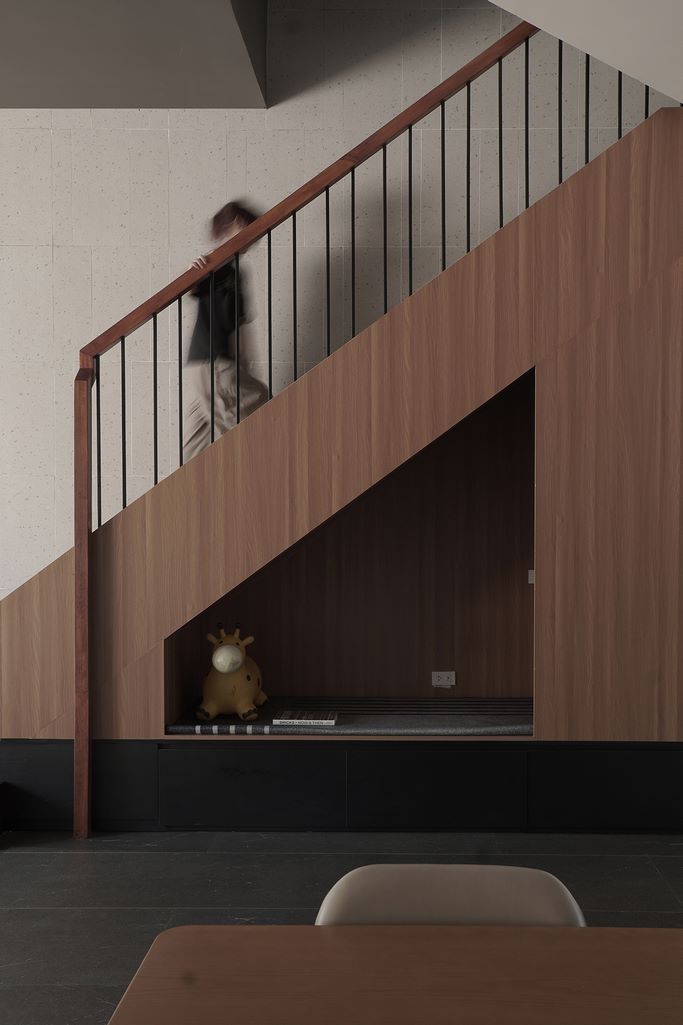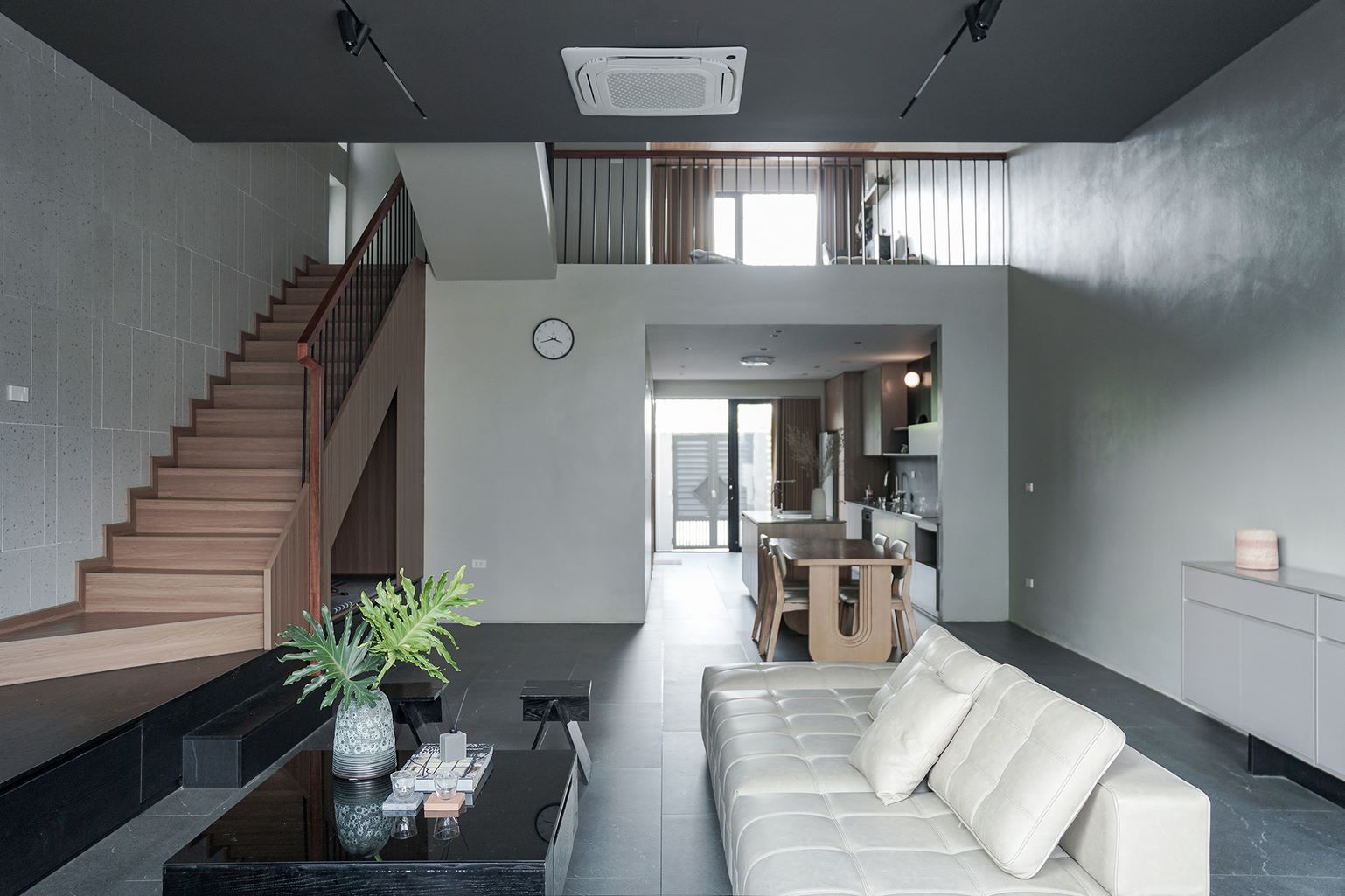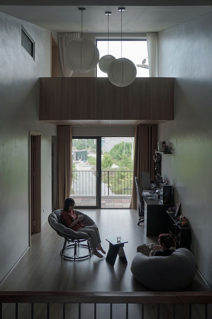 Khu vực sảnh thông tầng trong phòng khách cũng được khéo léo xoay chéo, để có thêm một góc nho nhỏ cho hai bé con vui chơi học tập, giúp cho sự tương tác của gia đình được cởi mở hơn. Tại vị trí này cũng được bố trí ô thông tầng để lấy ánh sáng gián tiếp và tạo lối cho thông gió tự nhiên.