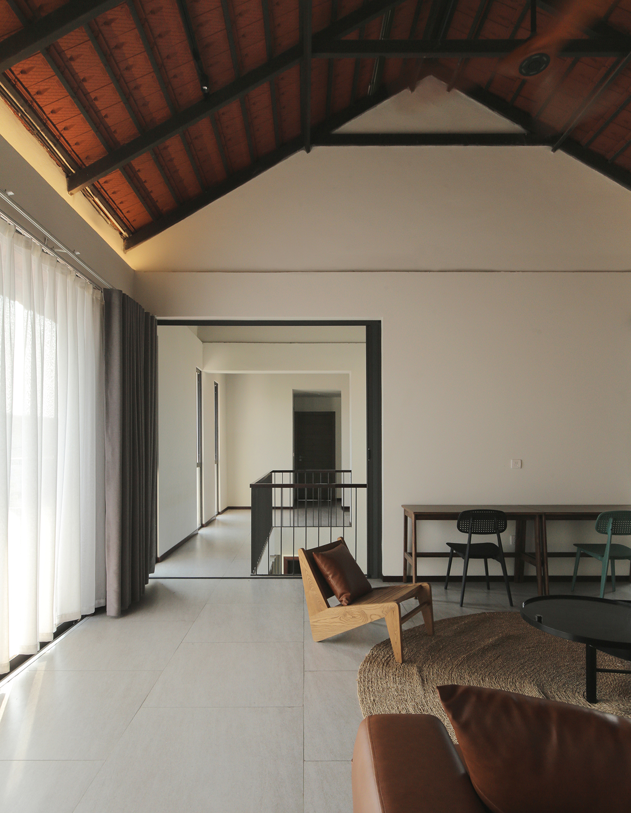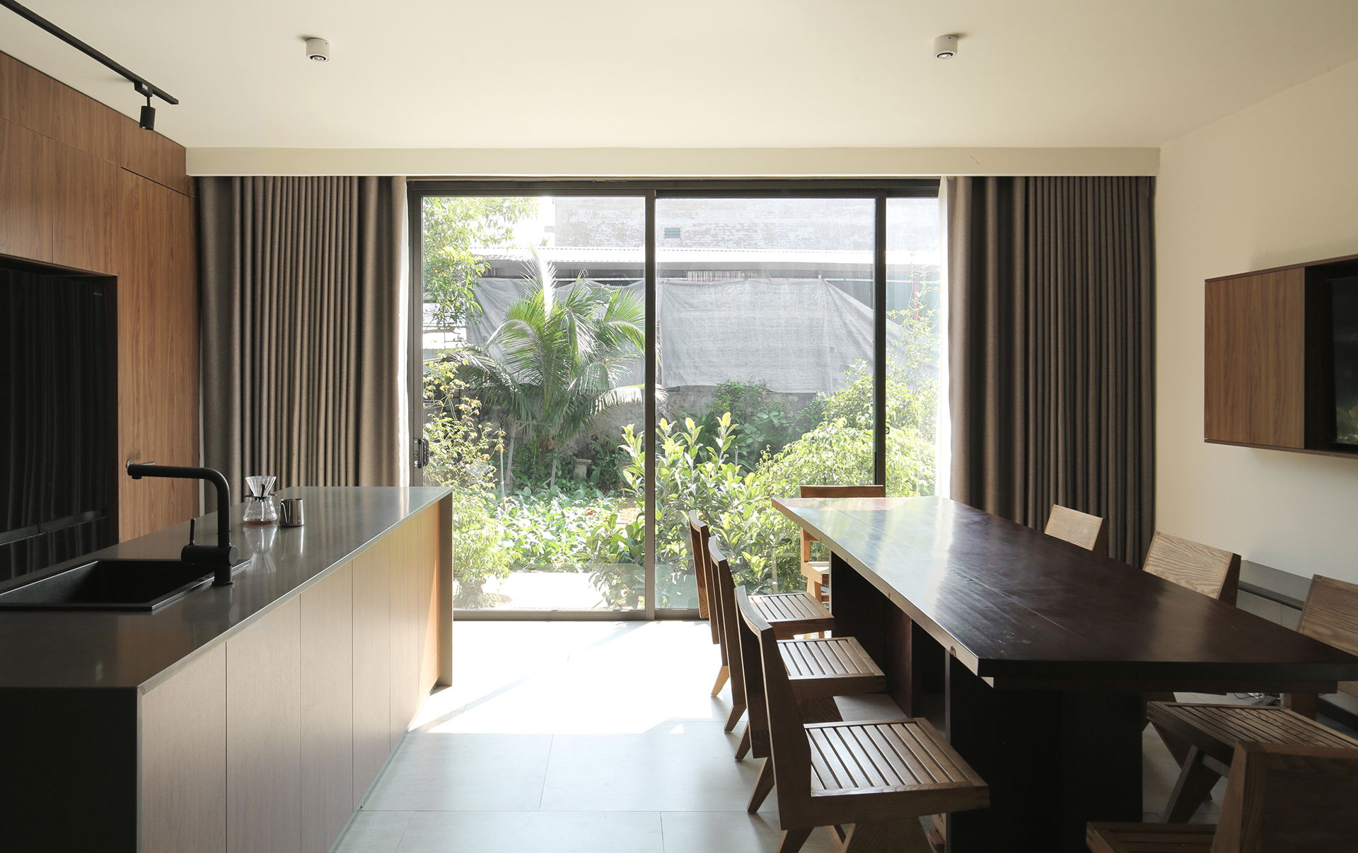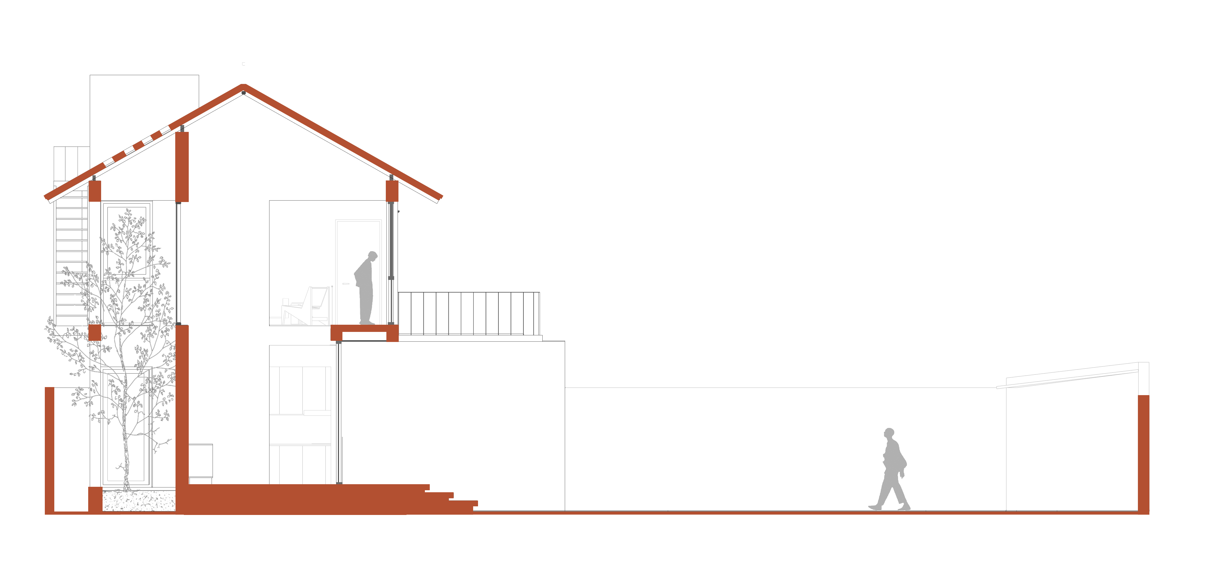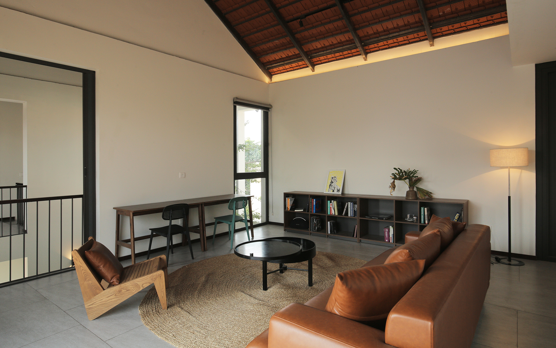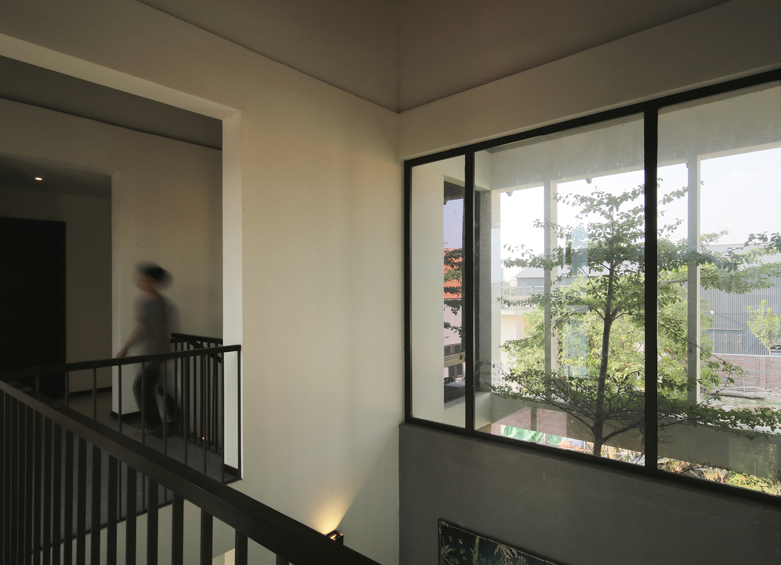 Công trình nằm nội khu Ecopark với mặt tiền và hệ kết cấu đã hoàn thiện sẵn. Gia đình chủ nhà gồm bố mẹ, 1 con trai và 1 con gái, một gia đình 2 thế hệ điển hình, mong muốn của chủ nhà là tạo ra một ngôi nhà có nhiều không gian chung để các thành viên trong gia đình có thể tương tác, sinh hoạt sau một ngày làm việc. Phương án chúng tôi đưa ra là đẩy trục giao thông đứng về phía cuối nhà, dồn diện tích lớn cho các không gian chính như phòng khách bếp, phòng ngủ master. Toàn bộ hệ thống thang bê tông cũ giữa nhà được phá bỏ, thay vào đó là hệ thang thép mỏng đặt phía cuối nhà để ánh sáng vào được sâu hơn. Vị trí sảnh thang được mở rộng cũng là không gian sinh hoạt nhỏ của gia đình, góc làm việc của bố, không gian chơi, đọc sách hay là tập đàn của các bé con.