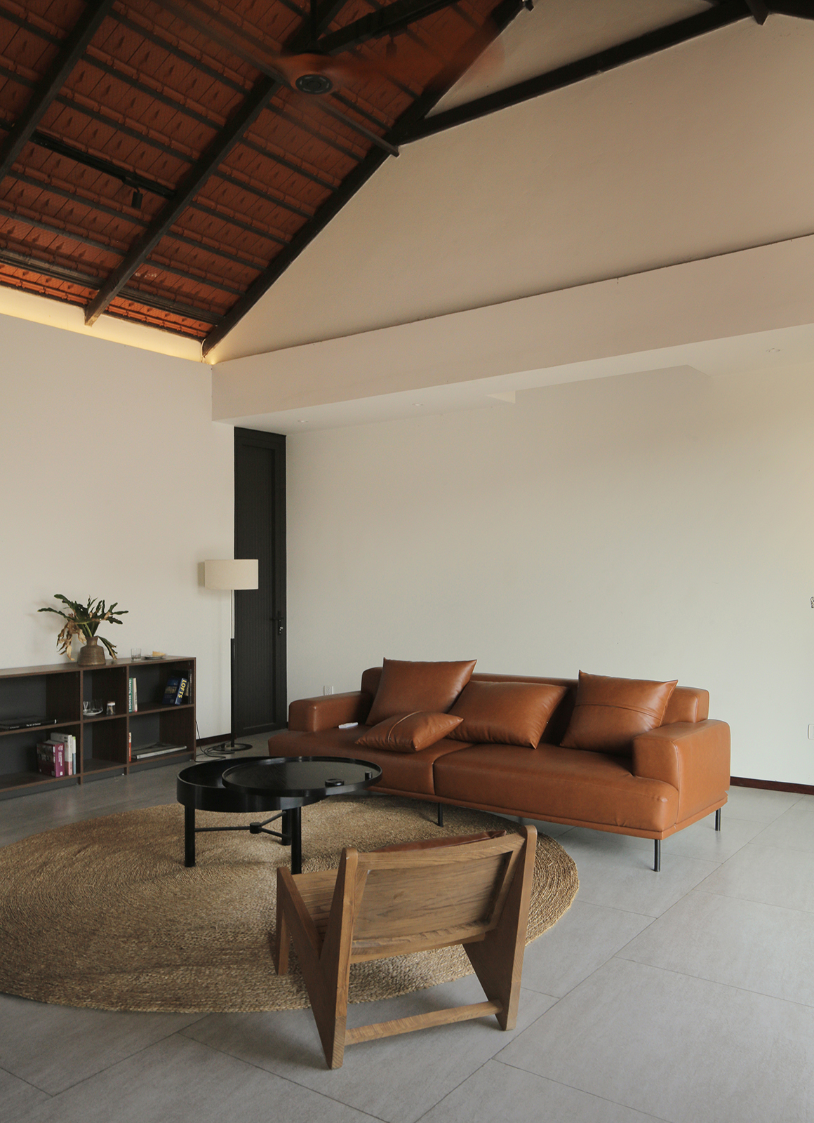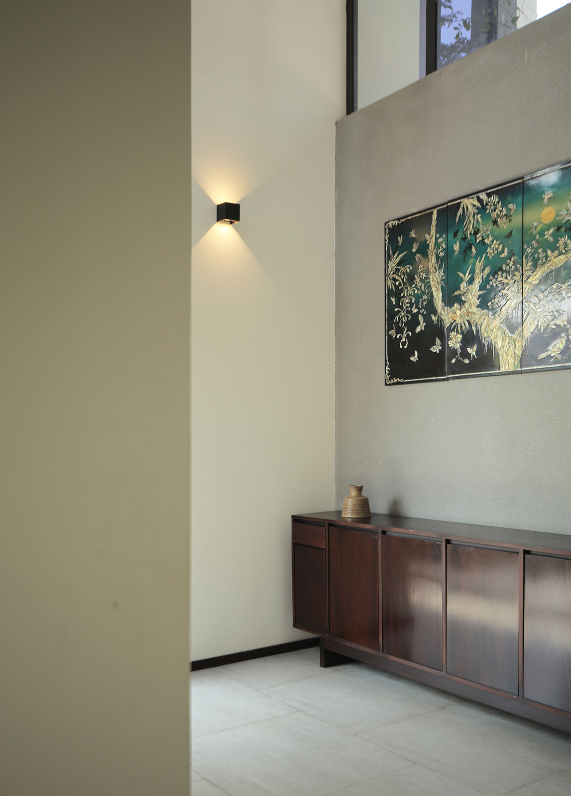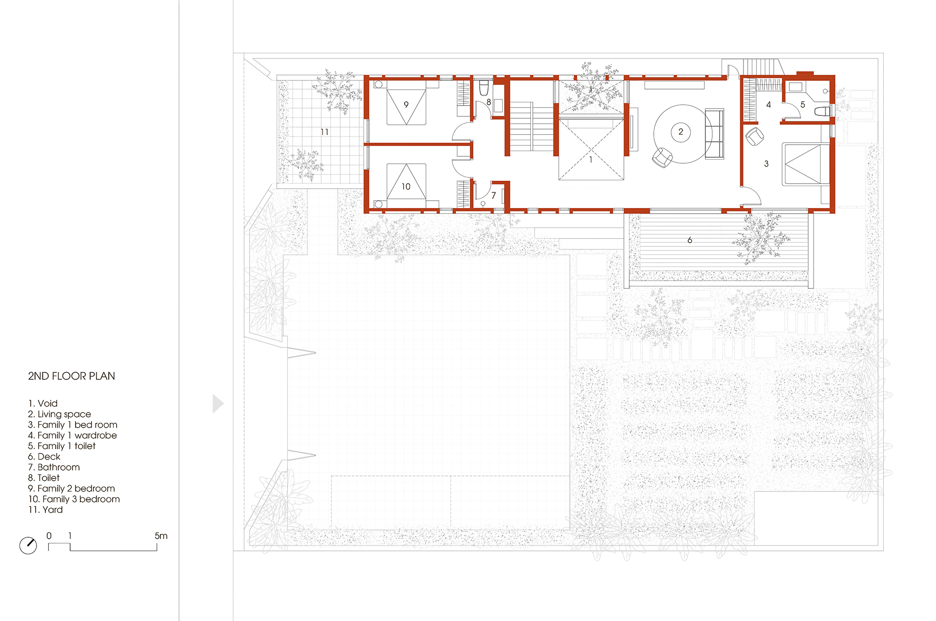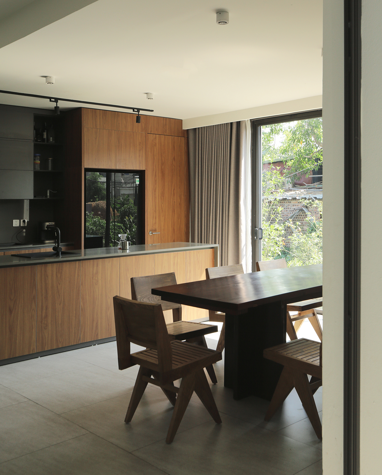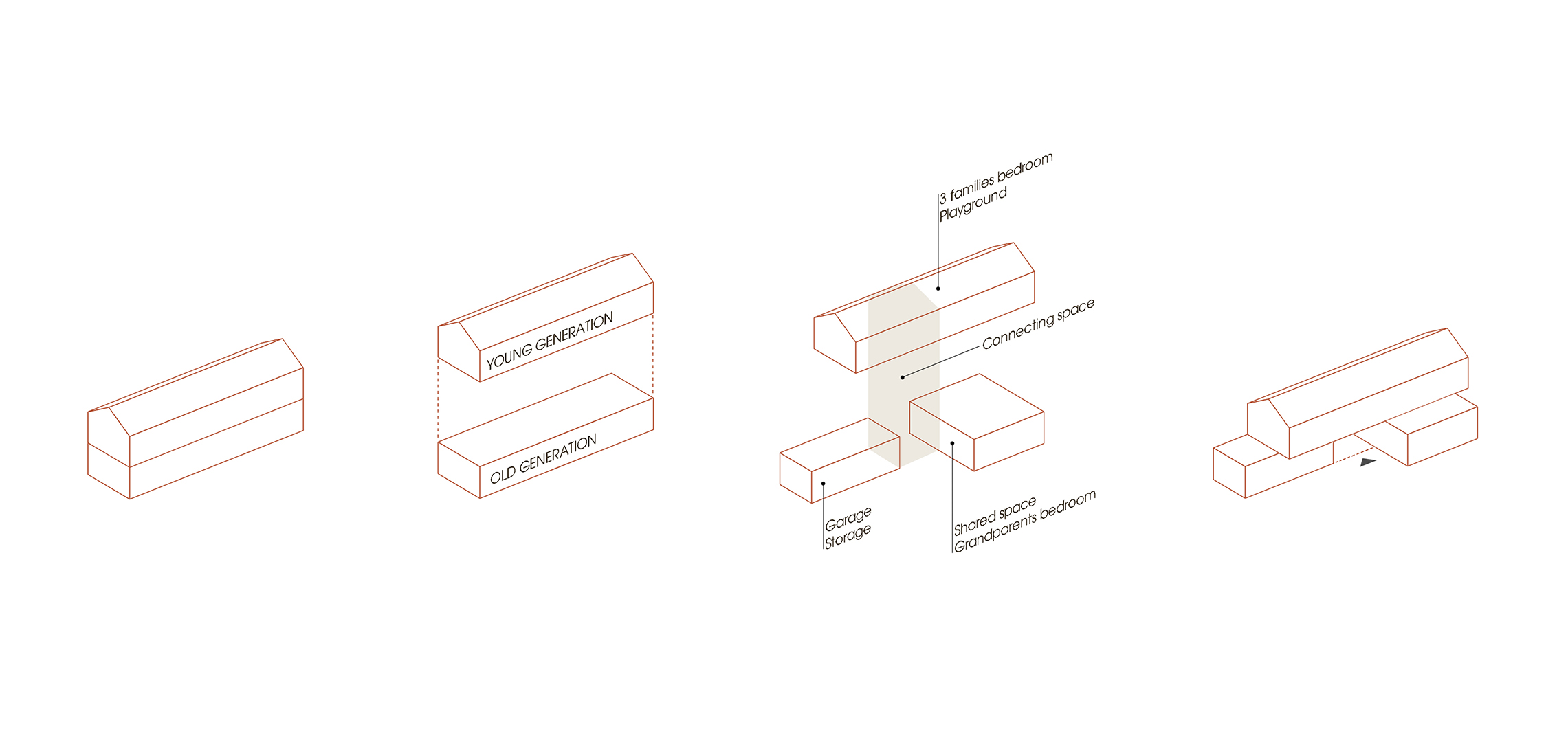 Công trình nằm nội khu Ecopark với mặt tiền và hệ kết cấu đã hoàn thiện sẵn. Gia đình chủ nhà gồm bố mẹ, 1 con trai và 1 con gái, một gia đình 2 thế hệ điển hình, mong muốn của chủ nhà là tạo ra một ngôi nhà có nhiều không gian chung để các thành viên trong gia đình có thể tương tác, sinh hoạt sau một ngày làm việc. Phương án chúng tôi đưa ra là đẩy trục giao thông đứng về phía cuối nhà, dồn diện tích lớn cho các không gian chính như phòng khách bếp, phòng ngủ master. Toàn bộ hệ thống thang bê tông cũ giữa nhà được phá bỏ, thay vào đó là hệ thang thép mỏng đặt phía cuối nhà để ánh sáng vào được sâu hơn. Vị trí sảnh thang được mở rộng cũng là không gian sinh hoạt nhỏ của gia đình, góc làm việc của bố, không gian chơi, đọc sách hay là tập đàn của các bé con.