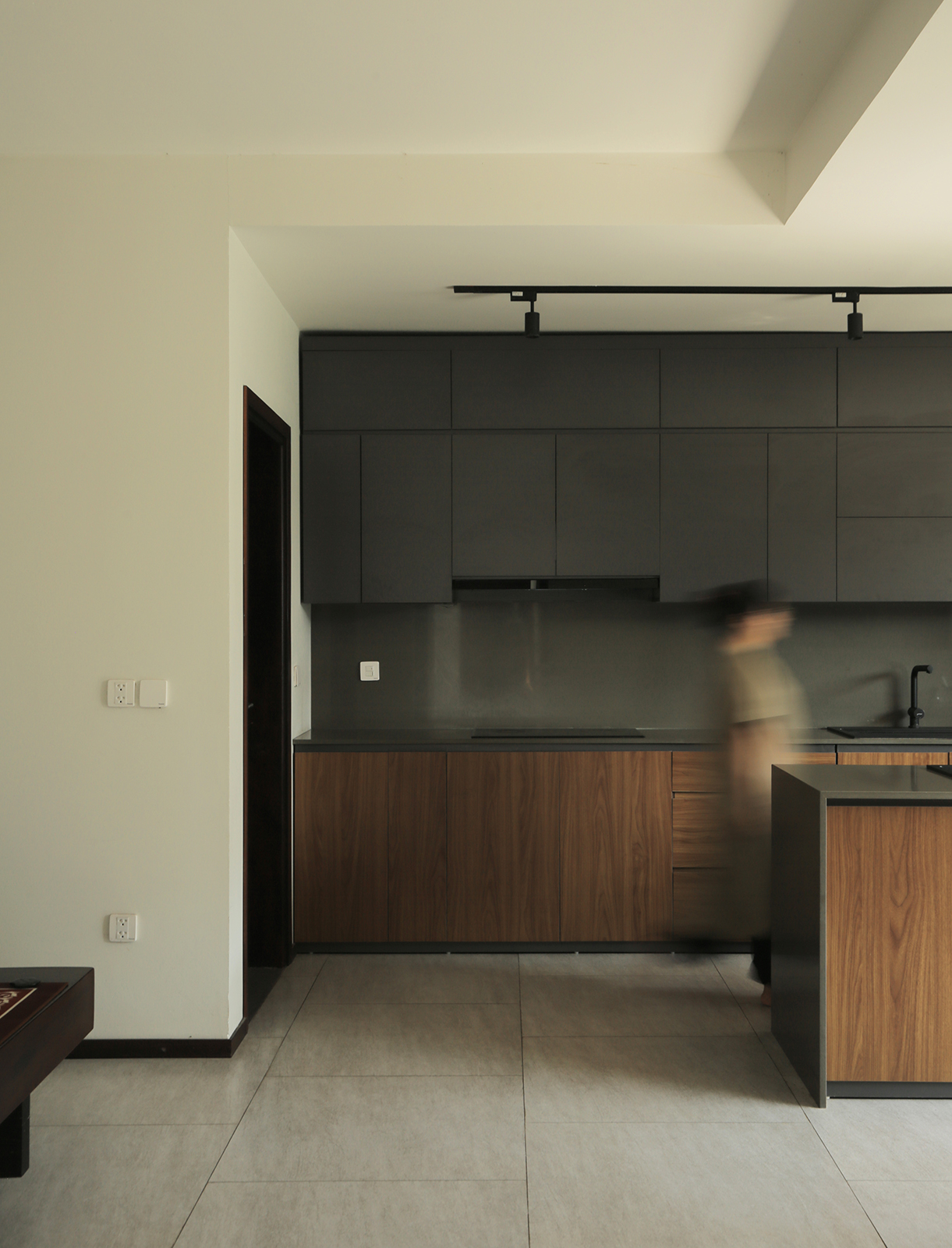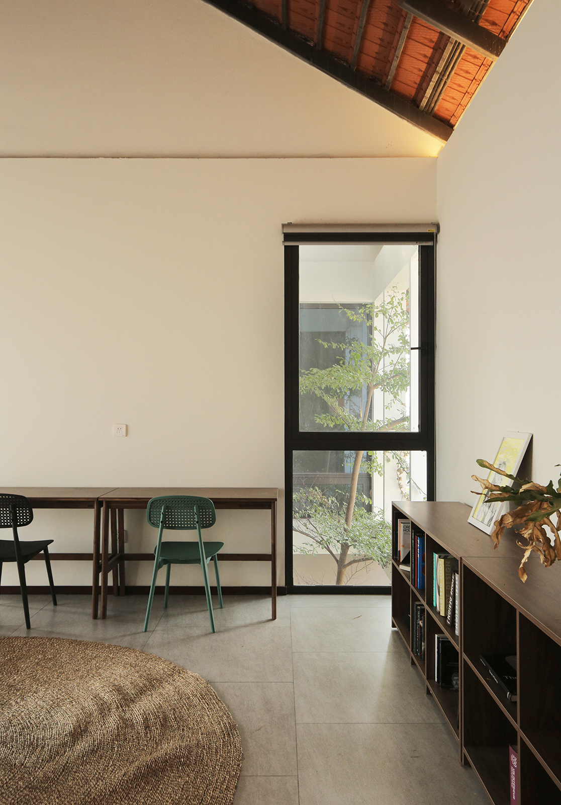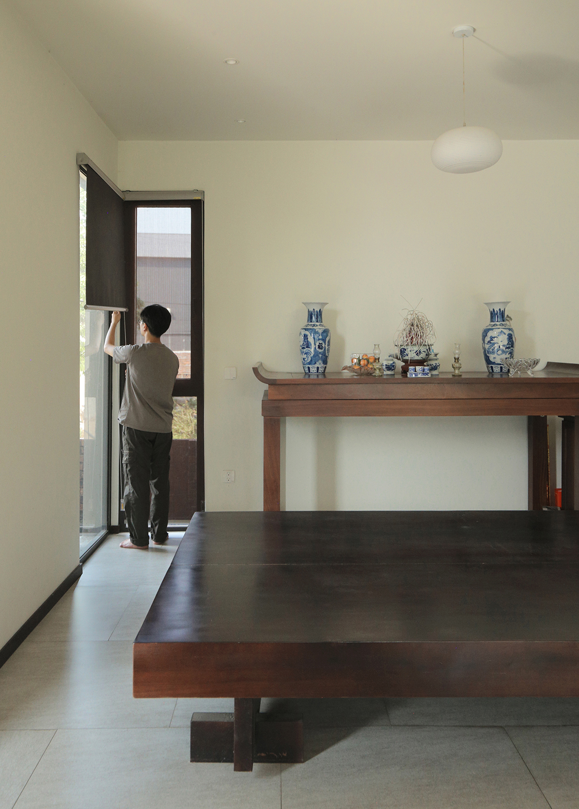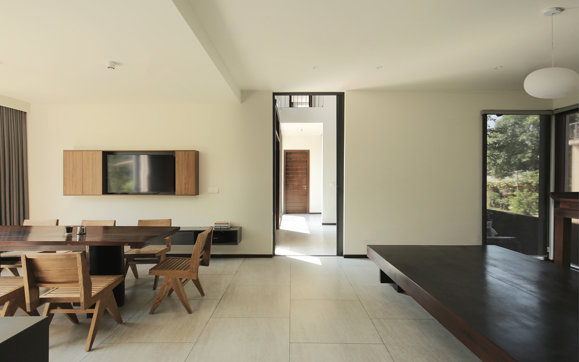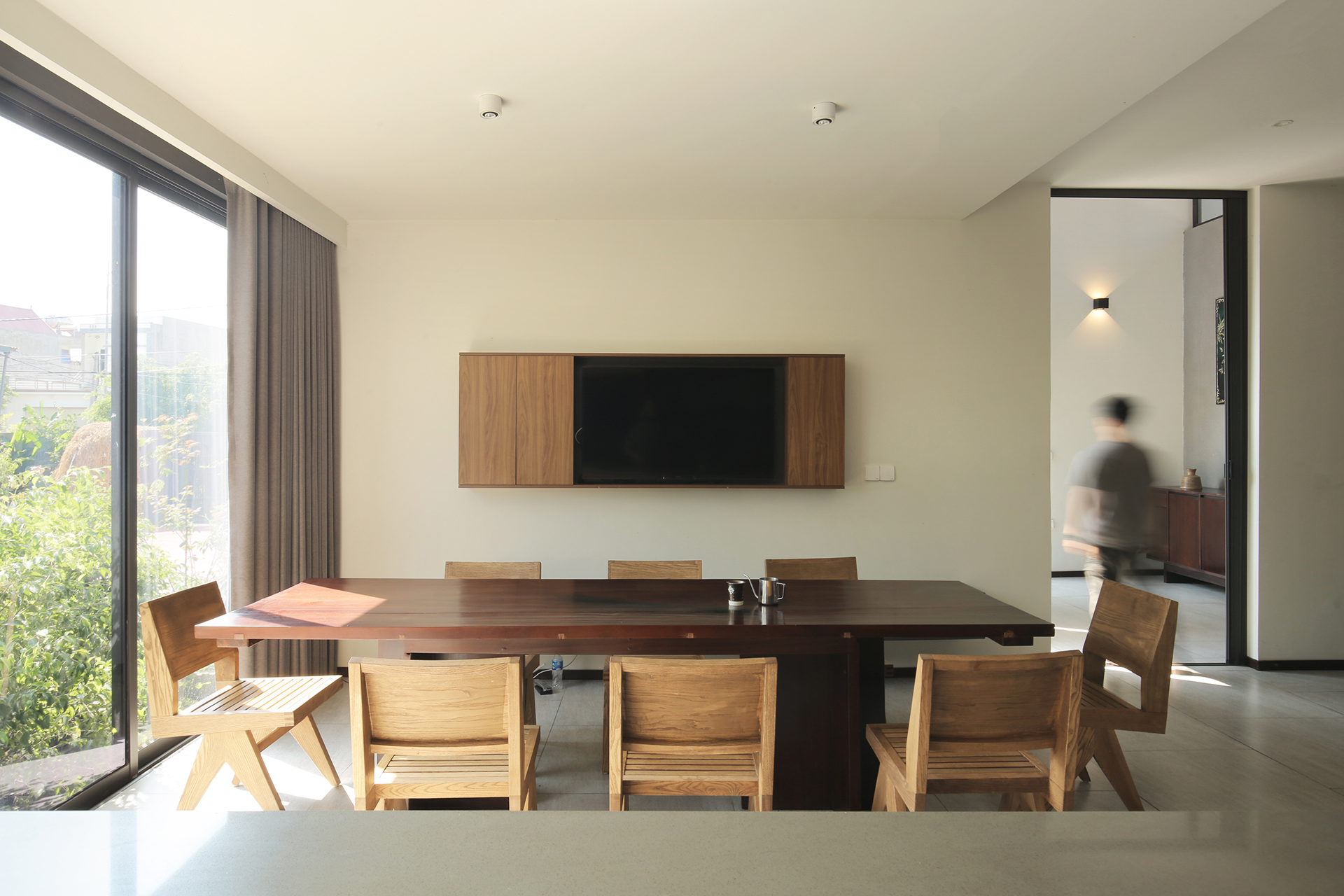 Công trình nằm nội khu Ecopark với mặt tiền và hệ kết cấu đã hoàn thiện sẵn. Gia đình chủ nhà gồm bố mẹ, 1 con trai và 1 con gái, một gia đình 2 thế hệ điển hình, mong muốn của chủ nhà là tạo ra một ngôi nhà có nhiều không gian chung để các thành viên trong gia đình có thể tương tác, sinh hoạt sau một ngày làm việc. Phương án chúng tôi đưa ra là đẩy trục giao thông đứng về phía cuối nhà, dồn diện tích lớn cho các không gian chính như phòng khách bếp, phòng ngủ master. Toàn bộ hệ thống thang bê tông cũ giữa nhà được phá bỏ, thay vào đó là hệ thang thép mỏng đặt phía cuối nhà để ánh sáng vào được sâu hơn. Vị trí sảnh thang được mở rộng cũng là không gian sinh hoạt nhỏ của gia đình, góc làm việc của bố, không gian chơi, đọc sách hay là tập đàn của các bé con.